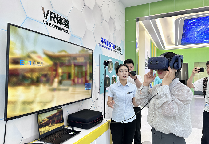 6月6日是第28个全国爱眼日,山西爱尔眼科医院青少年眼健康科普馆科普专员张科珍正带领参观者通过VR设备,体验白内障、青光眼、黄斑病变、糖尿病引起的视网膜出血以及高度近视引发的视网膜脱落等眼部疾病发病状态。该科普馆通过眼科道具、VR眼镜以及多媒体技术进行展示、体验、互动,对公众进行科普教育,从而唤醒青少年的爱眼护眼意识,让青少年重视眼健康。