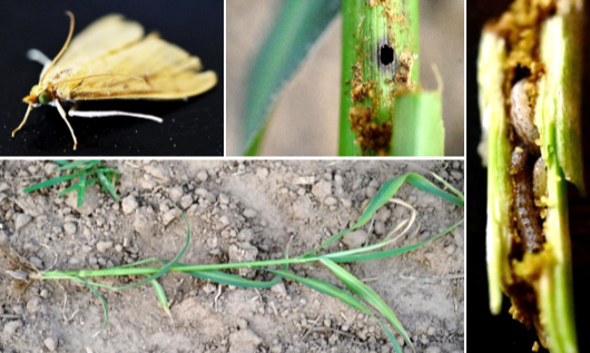 粟灰螟又叫谷子钻心虫;蛀茎为害;苗期枯心苗,后期形成白穗或折断倒伏。