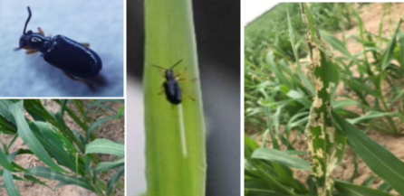 成、幼虫均为害。成虫沿叶脉啃食叶肉,成白条状,不食下表皮。幼虫钻入心叶内食叶肉,叶面现宽白条状食痕,造成叶面枯焦,出现枯心苗。