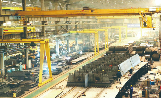 强烈的电焊弧光不断闪耀,焊花四溅;响亮的敲击声连续不断,此起彼伏。在各种自动化设备的助力下,下料、锯切、钻孔、焊接等一道道工序有条不紊地进行……