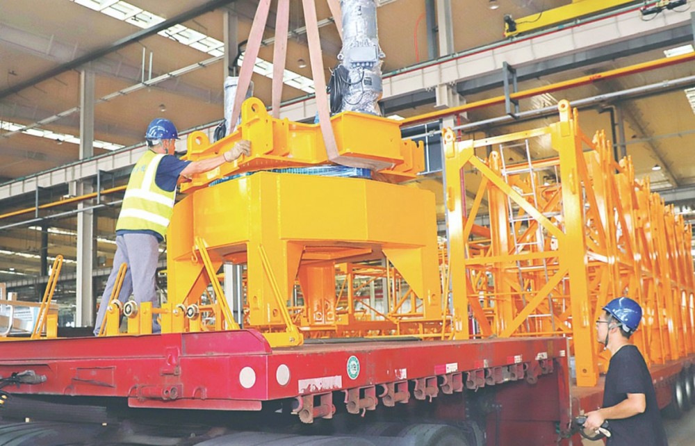 山西建投装备制造有限公司全力加快生产进度,确保完成全年任务目标。图为工人正在装车启运塔吊设备。