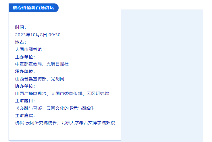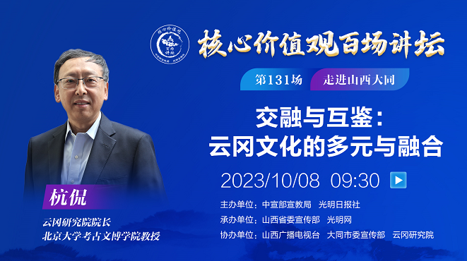 由中宣部宣教局、光明日报社共同主办的“核心价值观百场讲坛”第131场活动,将于10月8日走进山西大同。本场活动将邀请云冈研究院院长、北京大学考古文博学院教授杭侃,作题为《交融与互鉴:云冈文化的多元与融合》的演讲。