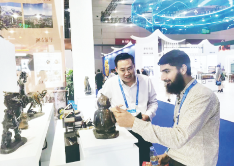 韩瑞来向外国友人热情介绍金钱石雕工艺 ■ 图片由受访者提供