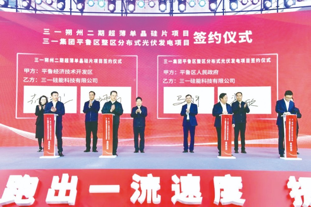本刊讯 10月27日,在三一朔州一期单晶硅项目投产不到一个月时间内,朔州市平鲁区与三一集团乘势而上,持续扩大合作成果,成功签订三一朔州二期大尺寸超薄单晶硅片项目和三一集团平鲁区整区分布式光伏发电项目合作协议,再次刷新项目落地建设“加速度”。朔州市委书记姜四清,三一集团董事、三一硅能董事长代晴华,三一集团副总经理、三一硅能朔州项目负责人胡大成,市领导何向荣、曹占贵、刘守斌等企地有关领导共同见证签约。