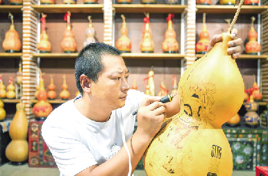 “它先将不同颜色的漆料堆涂在高低不平的器胎上,漆料干燥后再经打磨,从而产生出色泽亮丽、光滑异常、自然生动的艺术效果。”裴唐宇拿着一个上了大漆的葫芦对记者说。