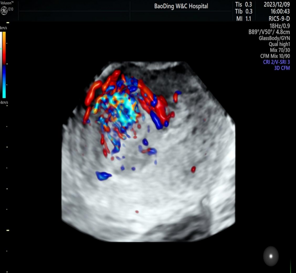 (超声图像:宫腔内异常的回声,可见五彩斑斓的血流)