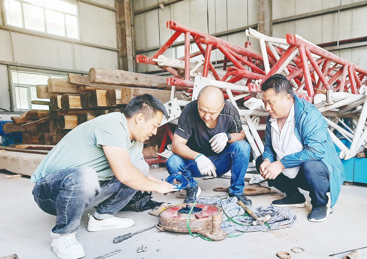 班组员工以节约理念为引领,积极主动落实节支降耗目标任务,突出“勤”字管理,加大过程管控,在设备使用中勤观察、勤保养、勤维修,不让设备带“病”超负荷运行,有效延长设备使用周期,实现降低材料消耗。图为钻探队组织人员保养钢丝绳导向轮轴承。