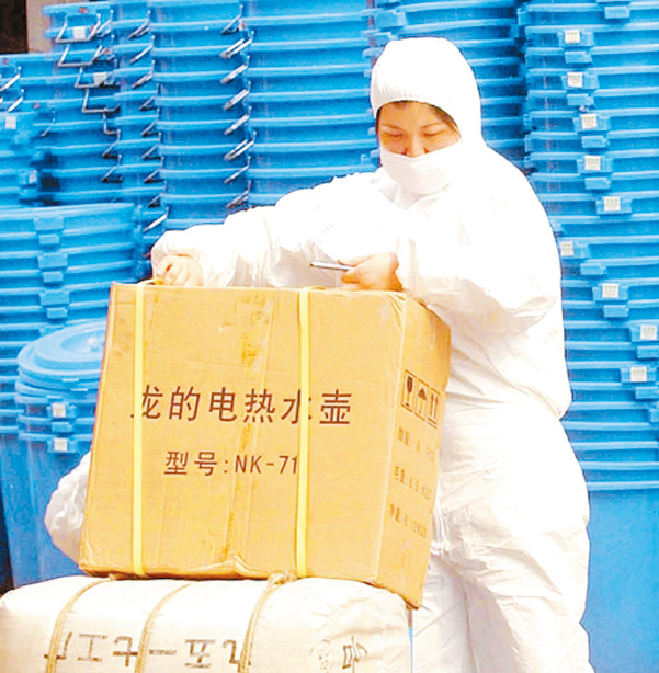2003年5月7日,北京小汤山“非典”定点医院的后勤保障人员在向隔离病区运送物资。新华社