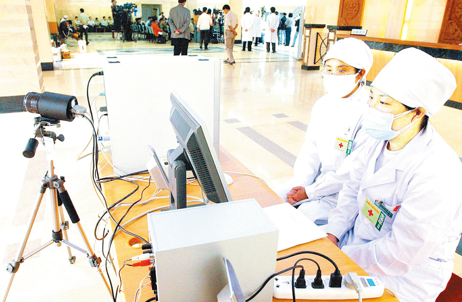 2003年5月7日,北京小汤山“非典”定点医院的两名工作人员在医院进出口通过红外热成像系统对进出人员进行体温监测。新华社
