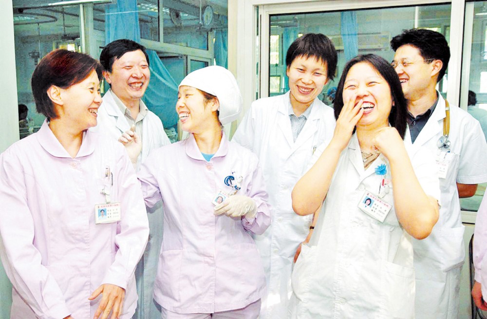 2003年6月24日,北京大学第一医院呼吸科重症监护病房的医护人员听到世卫组织对北京“双解除”的消息后,露出胜利的笑容。当日,世界卫生组织取消对北京地区的旅行警告,同时将北京从有疫情传播地区的名单上去除。新华社