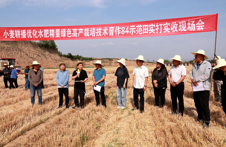 6月18日,小麦专家讲解测产技术要领。当日,晋中市太谷区农业农村局联合山西农业大学山西功能农业研究院小麦专家,在田间地头召开小麦耕播优化水肥精量绿色高产栽培技术晋作84示范田实打实收现场会,并组织全区种粮大户现场观摩交流学习。现场会旨在示范推广小麦高产栽培集成技术,整体提升现代农业技术水平,带动小麦产业发展,打造吨粮田,保障粮食生产安全。■科学导报记者刘娜通讯员孙泰雁摄影报道