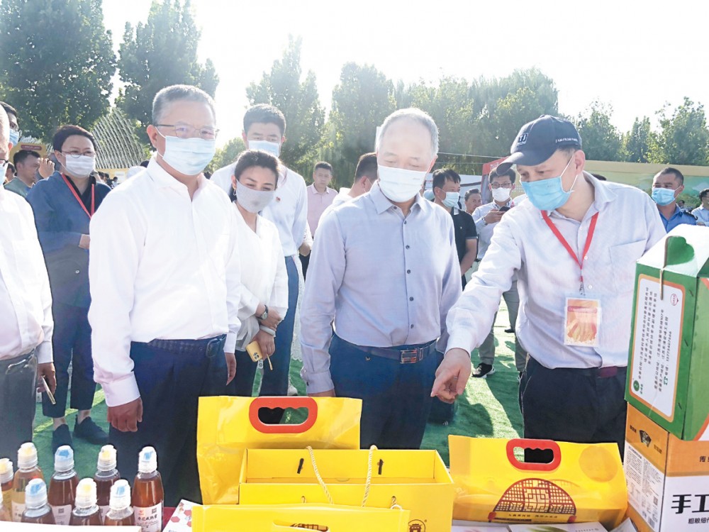 中国科协农技中心副主任王诚给农业农村部副部长马有祥等领导介绍山西临县等参展产品