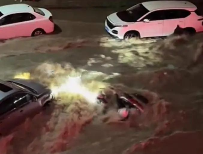 2024年7月5日,山东淄博市博山区因强降雨导致突发大水,一名男子驾驶两轮车发生侧翻,在急流中连人带车被卷走。