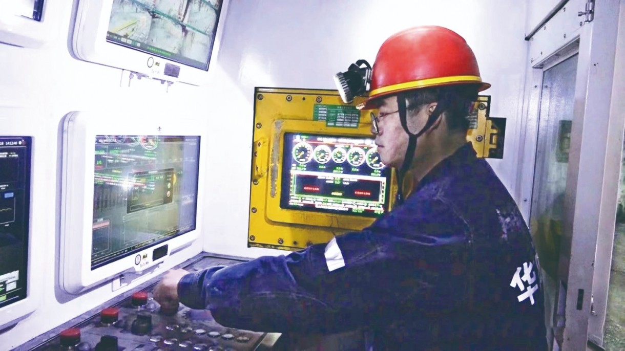 在二矿调度指挥中心,一面面高清显示器实时呈现着矿井采煤、掘进、“一通三防”等系统运转情况,外形高大上的综采智能化控制系统“太空舱”格外亮眼,身穿正装、打着领带的工作人员坐在里面,聚精会神地盯着屏幕上的一组组数据及视频监控画面。新一代矿工昨日还在井下辛勤作业,今日就体面地坐在宽敞明亮的调度指挥中心,轮班负责远程遥控采煤。在一系列安全确认后,工作人员轻点远程启动按钮,随着电脑屏幕各项数据由灰变绿,采煤机滚筒转了起来,滚滚乌金随之倾泻而下。