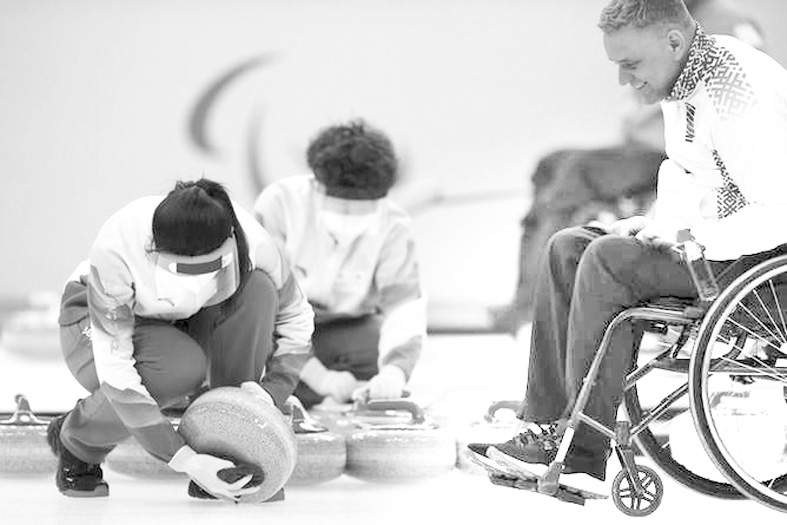 志愿者为运动员擦拭冰壶。北京2022年冬残奥会轮椅冰壶比赛期间,在国家游泳中心“冰立方”内有一群协助运动员完成比赛的志愿者。对于坐在轮椅上的运动员来说,在冰上拿取、移动重约40斤的冰壶很不方便,于是每条赛道分配了两人一组的志愿者,由他们进行擦冰壶、摆冰壶、收无效壶的工作。一场冰壶比赛大约两个半小时,每场比赛志愿者们要擦壶约64次。志愿者们在赛前还会为运动员清洁轮椅,保障赛事顺利进行。据介绍,北京冬残奥会期间,“冰立方”内共有20位志愿者负责这项工作,他们都是在校学生,每天志愿服务时长约8小时。