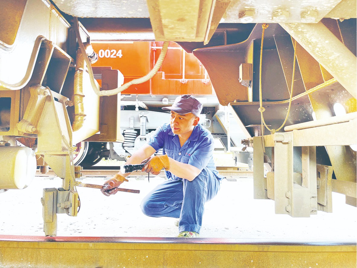 晋能控股装备制造集团铁运公司围绕安全生产化达标创建工作,强化制度和执行上的落实,细化深化各类基础工作,持续提升职工安全意识。图为该公司机车司机在机车出发前进行部件检查工作。