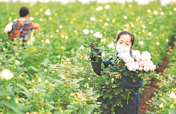3月6日,太原市晋源区振华园艺玫瑰产业园内,员工正在采摘玫瑰。该产业园充分利用区位优势和政策优势,从传统盆栽花卉种植向鲜切花花卉种植延伸拓展,实现创新增效,目前可每天向市场提供1000枝订单任务。