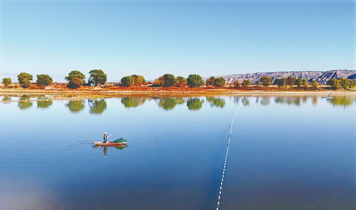 11月29日,万荣县汾河滩,渔民划着小船在鱼塘里布网劳作。一人一舟,一山一水,呈现出一幅人与自然和谐共生的美丽画卷。近年来,万荣县坚持扛起生态文明建设的政治责任,集中力量加快推进“一泓清水入黄河”项目建设,切实抓好污水处理工程运维,确保断面水质稳定达标。