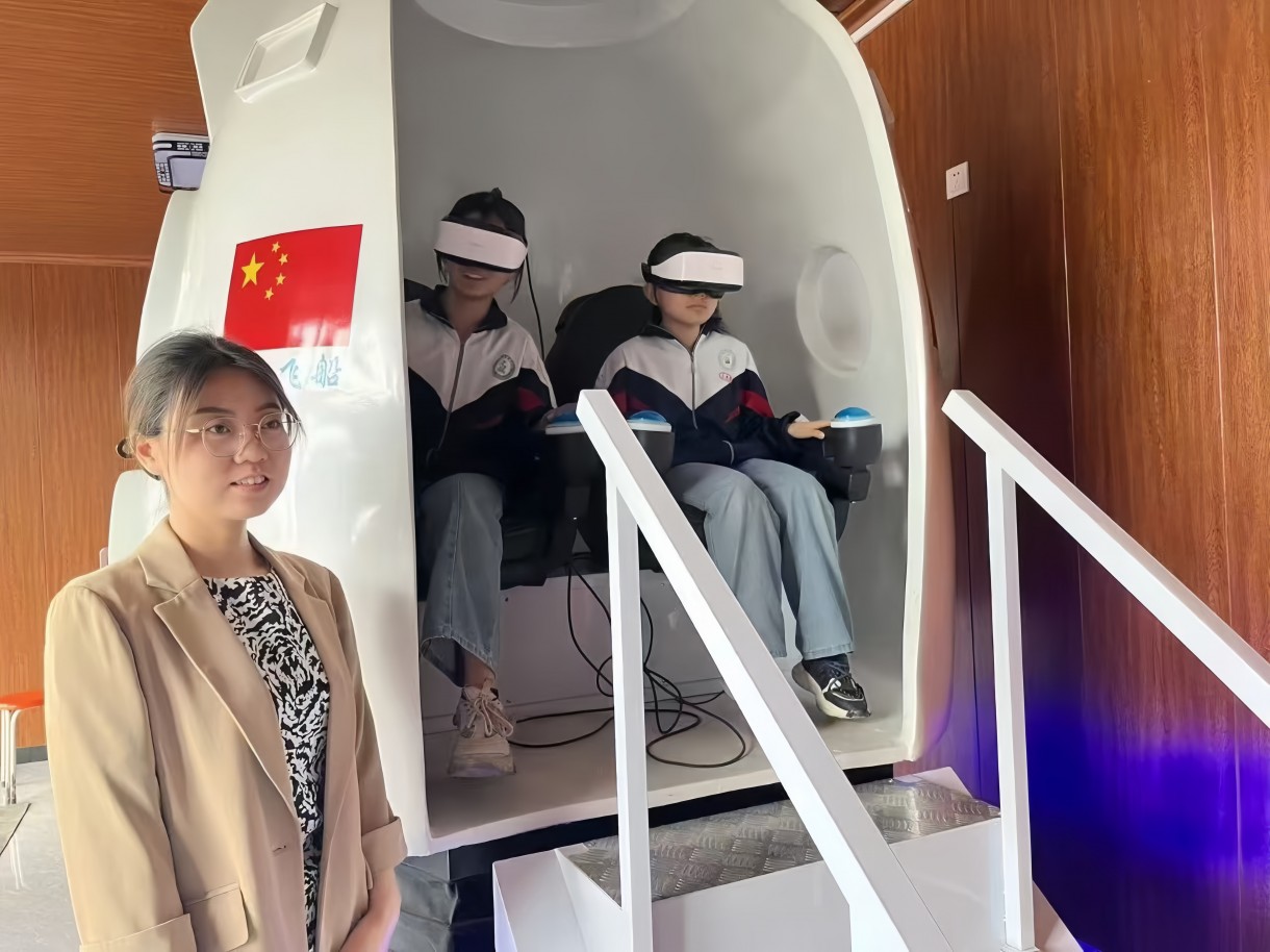 12月15日,忻州市河曲县西口镇唐家会村,一群小朋友在科技游乐园体验“太空游”VR神舟返回舱模拟设备。据了解,科技游乐园引进的这款模拟仓真实还原了神舟返回舱内部场景,孩子们可通过佩戴高科技VR眼镜,以第一视角体验航空全过程,身临其境过一场“科幻瘾”。