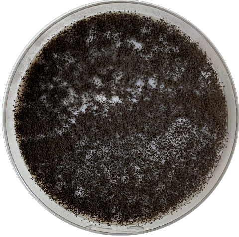 1黑曲霉(A.niger)。属曲霉属,黑曲霉群。25—30℃在马铃薯葡萄糖琼脂培养基上菌落生长迅速,10天左右菌落可达2.5-3厘米,菌落初为白色,常有鲜黄色区域,厚绒状,继而黑色,背面无色或中央部分略带褐色。在沙氏琼脂上生长迅速,3d内成熟,开始为白色绒毛状,菌落中央逐渐出现很淡的黄色,继而变成粗绒状黑色或黑褐色,背面无色或者淡黄色,见图2至图4。其以菌落颜色黑色(niger)命名。