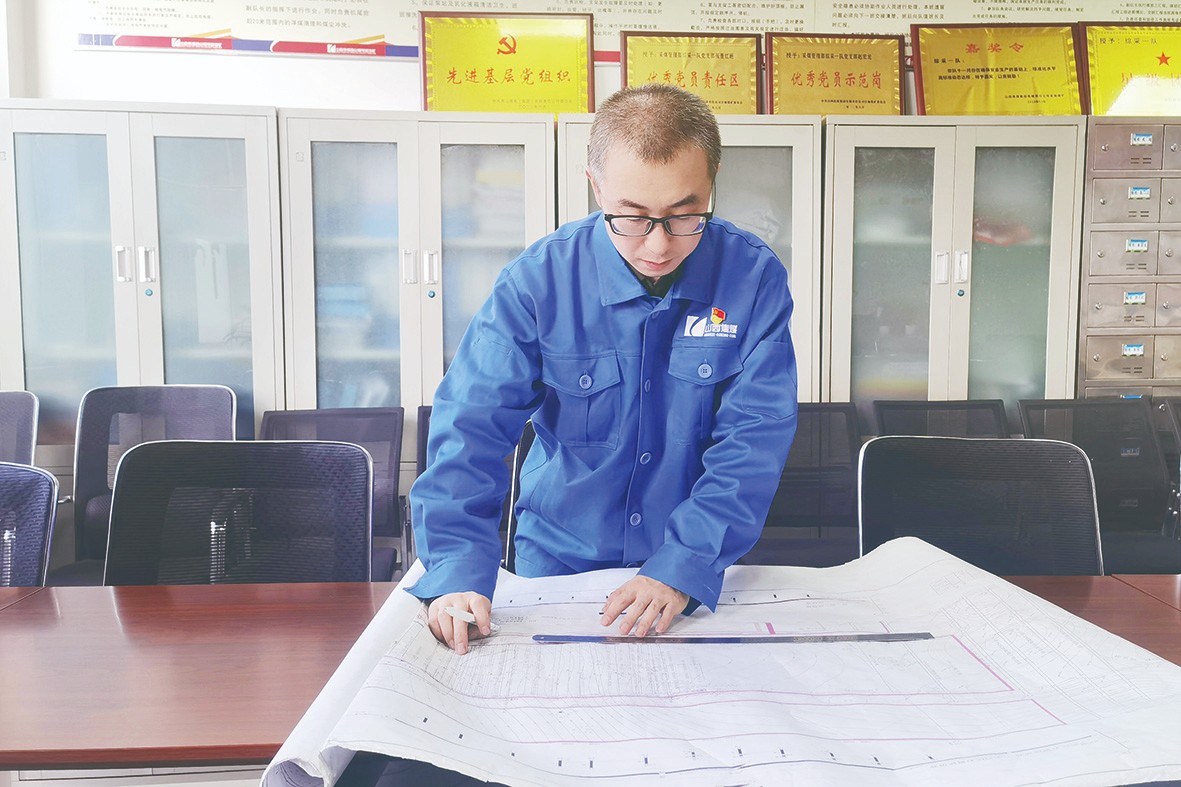 刘佳伟在图纸上进行标记,提前制定安全防范措施。 杨吉摄