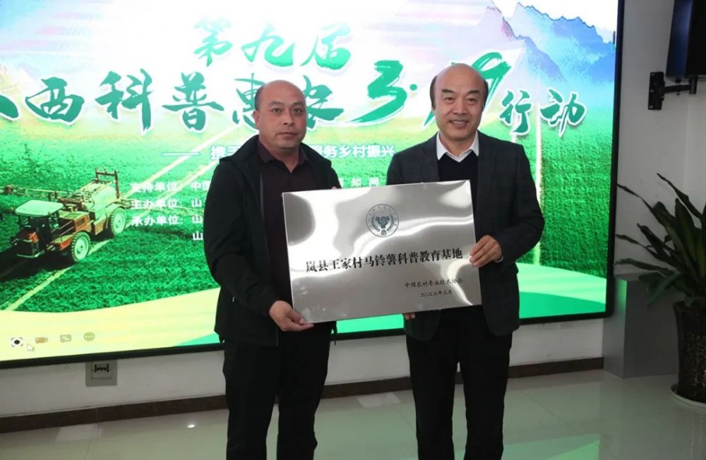 ▲ 受中国农技协委托,郝建新为中国农技协岚县王家村马铃薯科普教育基地授牌