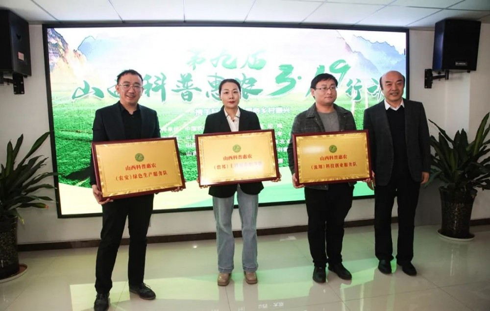 ▲ 郝建新为山西科普惠农(流翔)科技创业服务队、山西科普惠农(碧邦)土壤健康服务队、山西科普惠农(农安)绿色生产服务队授牌