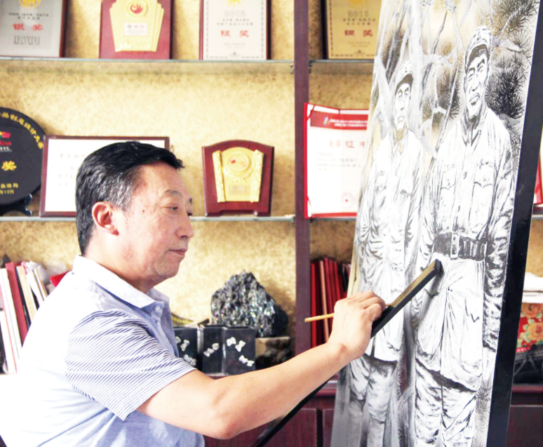 贾兴林在创作漆画《太行浩气》