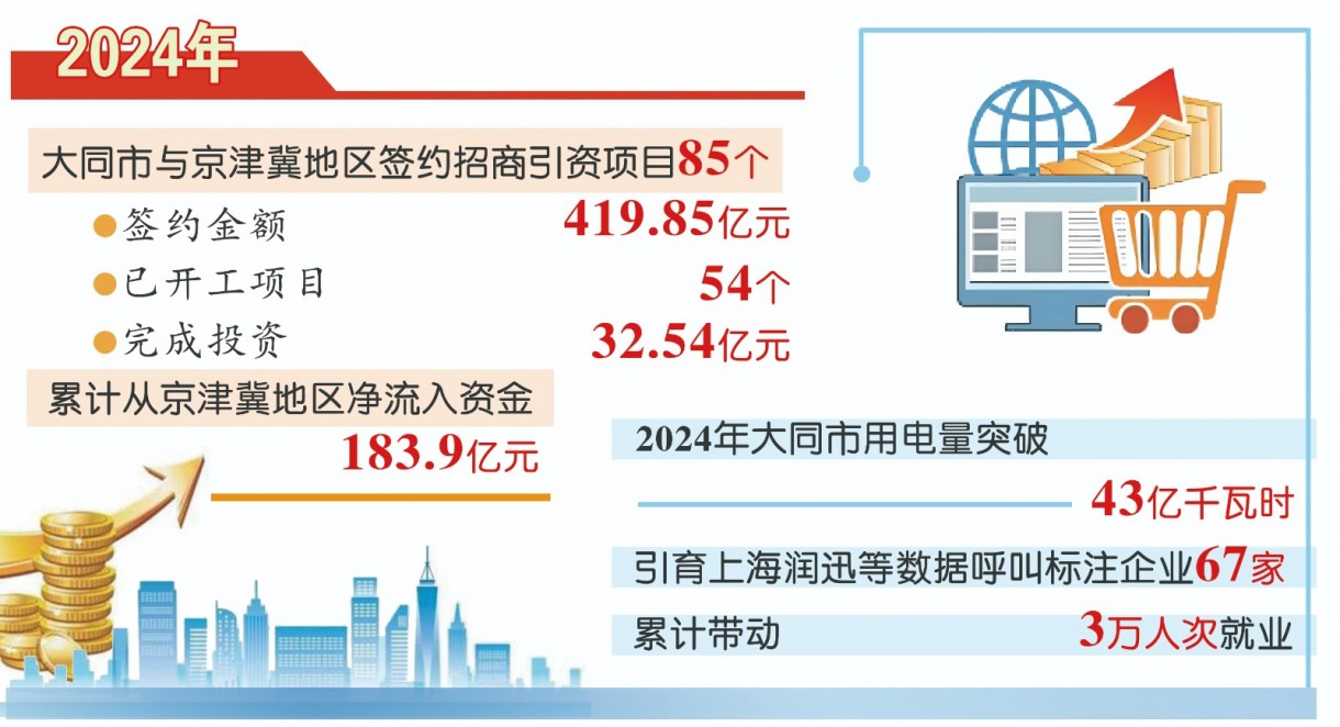 2024年,大同市与京津冀地区签约招商引资项目85个,签约金额419.85亿元,已开工项目54个,完成投资32.54亿元。累计从京津冀地区净流入资金183.9亿元。一组组数据彰显出大同在融入京津冀协同发展中的积极作为与显著成效。
