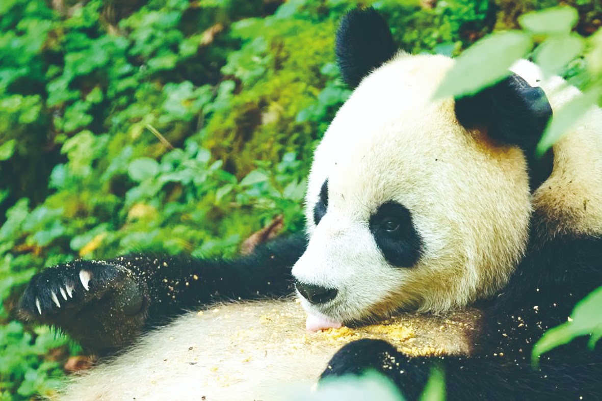 培训场内,母熊猫“贤贤”在吃工作人员投喂的窝窝头。■沈伯韩摄