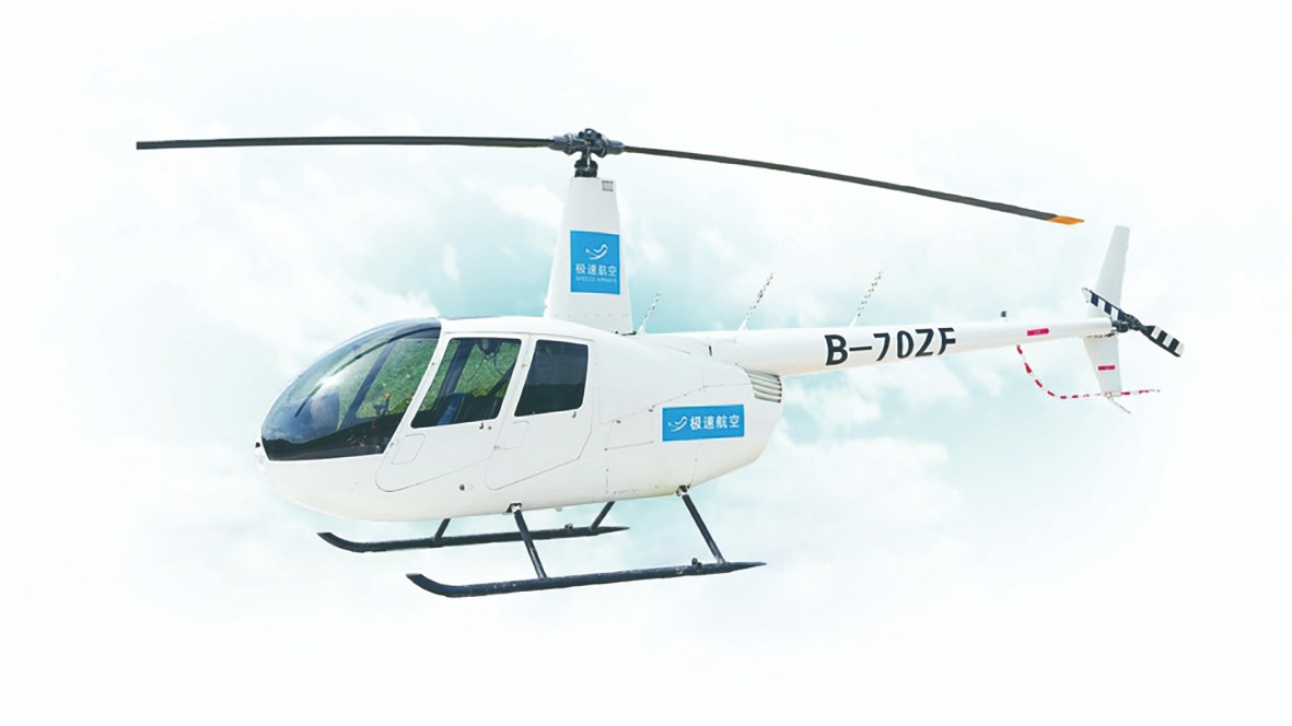 罗宾逊R44直升机在弓阳飞行营地进行不同应用场景的飞行任务。