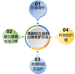 肾病综合征的日常养护方法主要包括:饮食调节、建立健康生活习惯、合理用药及监护、并发症护理4个部分,如下图所示: