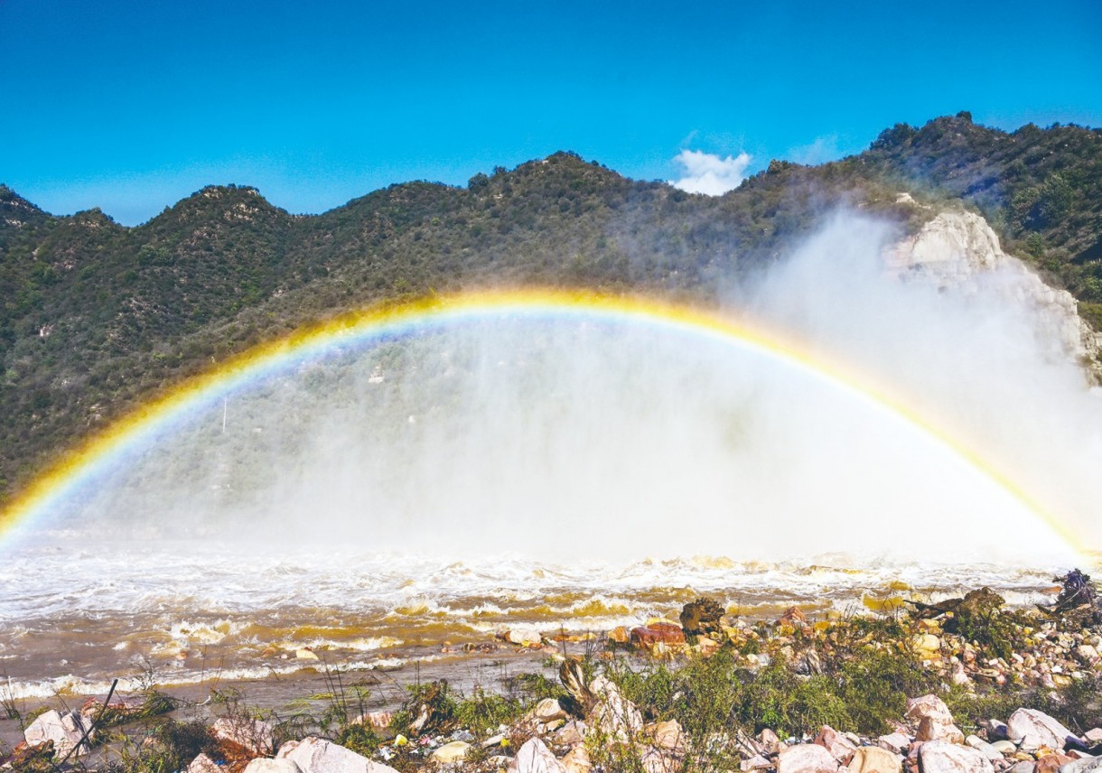 10月13日,雨后天晴。山西晋中市左权县麻田镇九腰会村清漳弯从山谷间喷涌而出的洪流,如万马奔腾,气势壮观。河面升起的水雾缥缈如纱,在阳光的映射下,形成美轮美奂的彩虹横跨河岸。蓝天、白云、阳光、河水与秀美的太行山脉交相辉映,构成一幅壮美迷人的自然景观,仿佛置身于仙境,让人流连忘返。