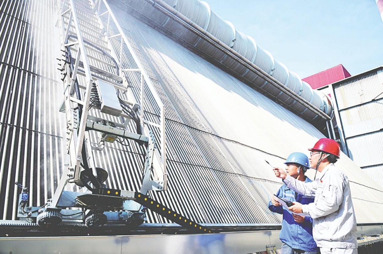 晋控电力同华发电公司空冷岛智能机器人正在进行冲洗操作。史旭东摄