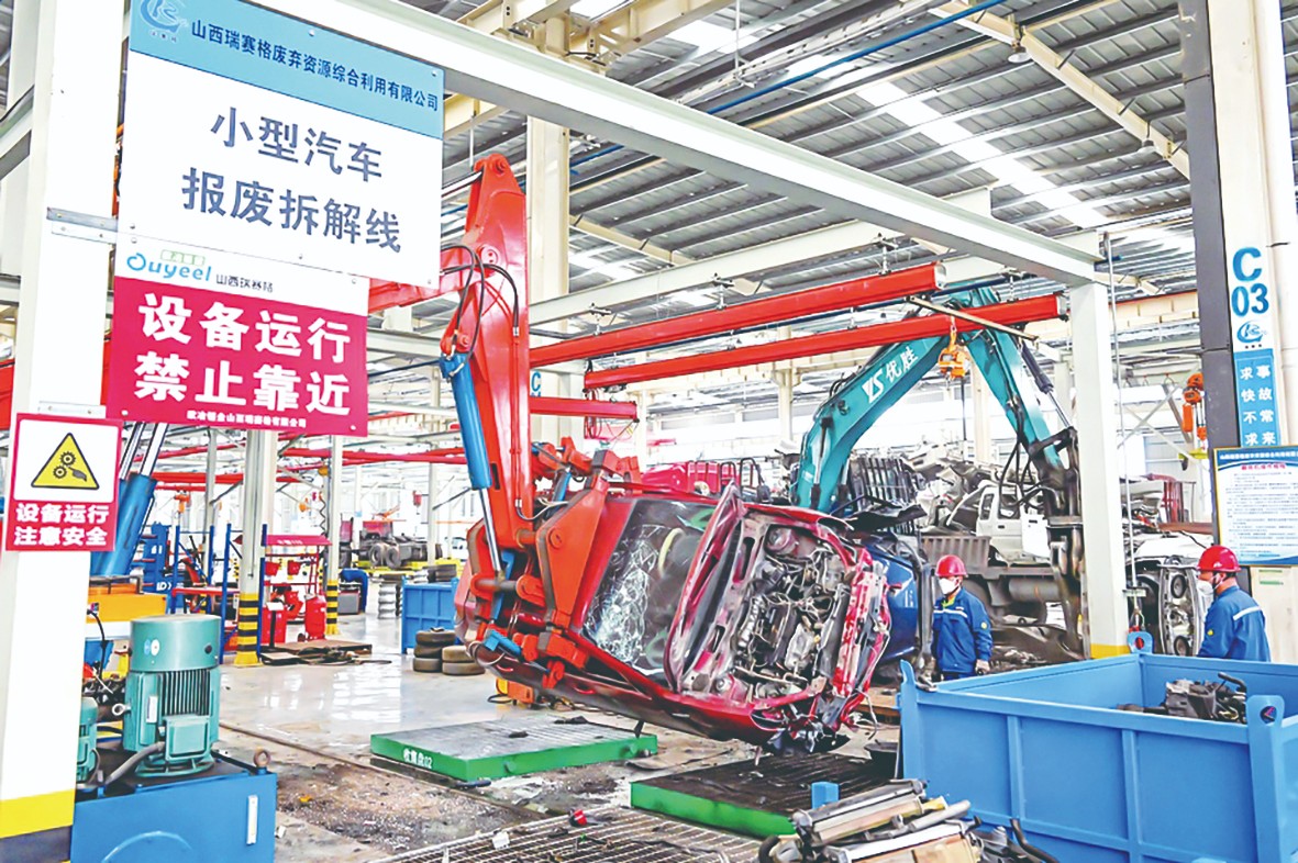 11月29日,在山西瑞赛格废弃资源综合利用有限公司,工人正拆解报废机动车。该公司形成了小型汽车、大型汽车和摩托车三条拆解流水线,每天每条生产线拆解已达到100辆。