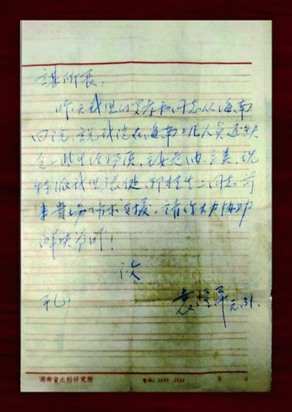 “谌所长:昨天我组的罗孝和同志从海南回院,说我院在海南工作人员还缺乏一些生活物资,主要是油、豆类,现特派我组张健、郭桂生二同志前来贵场请求支援,请你大力协助解决为盼!”