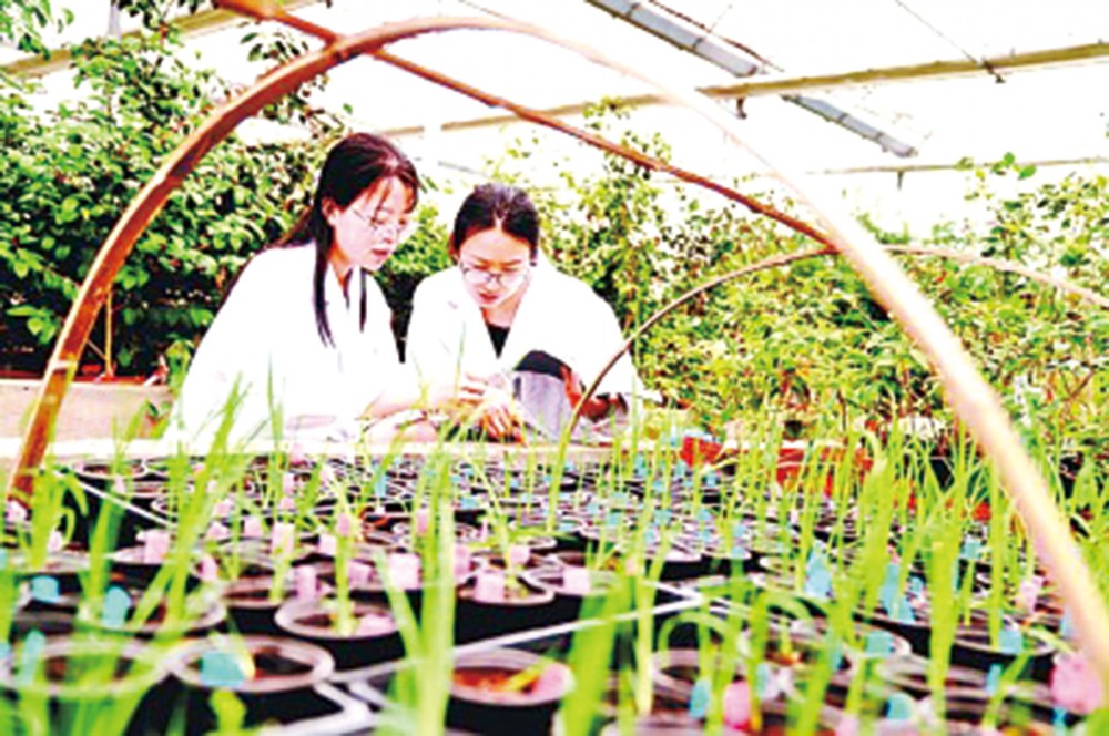 上海植物园科研人员程琳(左)、张蕾蕾在温室观察记录花菖蒲新品种生长情况。 ■ 新华社发
