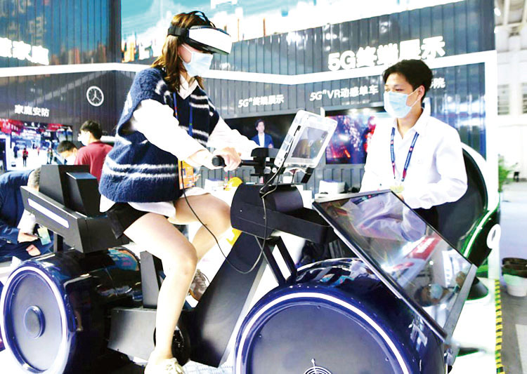 4月25日,在第四届数字中国建设峰会数字成果展览会上,一名观众在体验基于5G技术的VR动感单车。