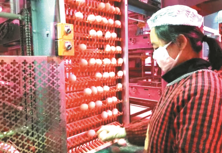 工作人员在收集鸡蛋