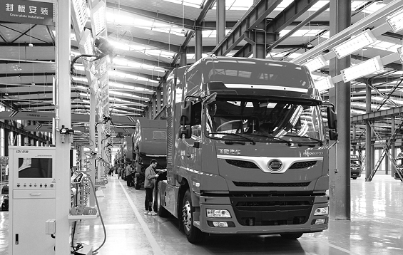 10月7日,工人正在对氢燃料电池重卡进行装配调试。
