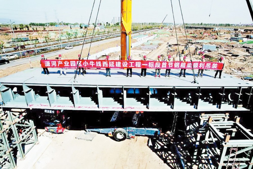 本刊讯 日前,山西综改示范区小牛线西延建设工程第一标段小牛线西延与滨河东路互通立交桥钢箱梁成功首吊,标志着该互通立交桥取得突破性进展。