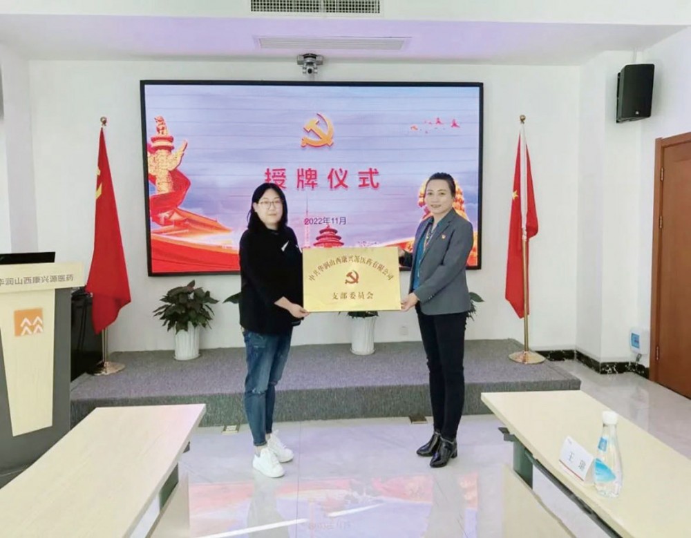 本刊讯 2022年11月1日,太原中北高新技术产业开发区党工委为华润山西康兴源医药有限公司党支部进行授牌。