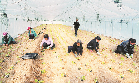 近年来,运城市闻喜县后宫乡持续加快现代农业发展步伐,重点在设施农业上做文章,通过完善日光温室大棚、园区道路、交易市场等基础设施,配套恒温冷库,为蔬菜产业高质量发展提供保障,形成以西红柿为主、圣女果与其他蔬菜为补充的蔬菜产业发展新格局。图为后宫乡阳庄村村民正在大棚里种植白菜。