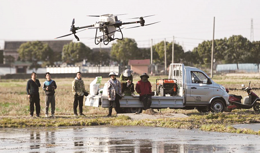 种粮户在宁波市奉化区西坞街道四维村的水稻秧田操控植保无人机施肥。正值春季农忙时节,浙江省各地田间地头一片繁忙景象,人们积极开展春耕备耕生产活动。