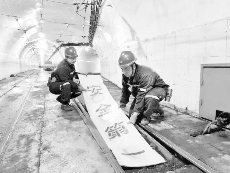 华阳股份二矿要求全员牢固树立“安全是管出来的”理念,坚持预防为主,强化源头管控,全面推进安全生产标准化建设,为打造高质量本质安全型矿井奠定坚实的基础。图为该公司职工正在道岔中间铺设自制的安全警示语。