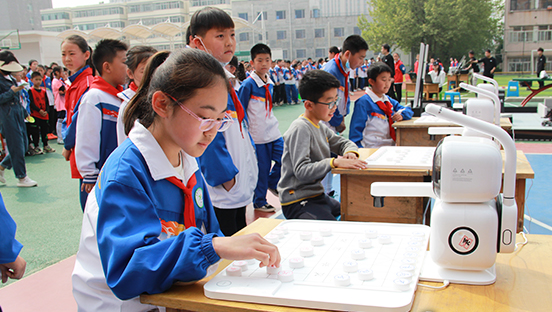 当日,智能无人机、编程机器人等一系列新兴科技产品也在活动现场展出。通过工作人员的讲解、演示,现场学生纷纷参与其中,亲身体验与AI智能下棋机器人对战、操作机器人移动等。活动还发放青少年科普读物百余册,现场学生兴趣浓厚、气氛活跃。