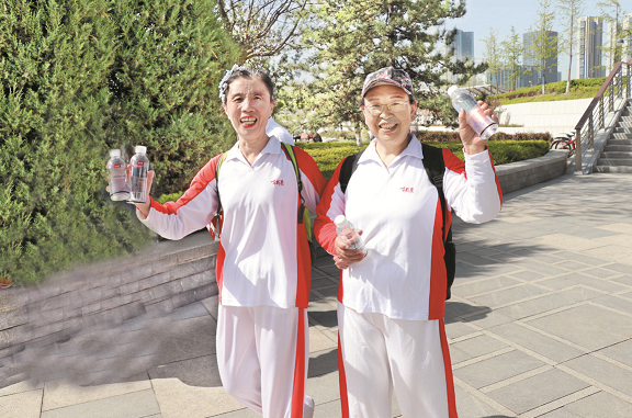参加启动仪式的健步走爱好者展示免费领取的“月明堂”氢原子水
