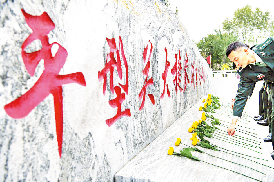 2020年9月25日,在位于山西省大同市灵丘县的平型关大捷纪念馆,工作人员向革命先烈献花。