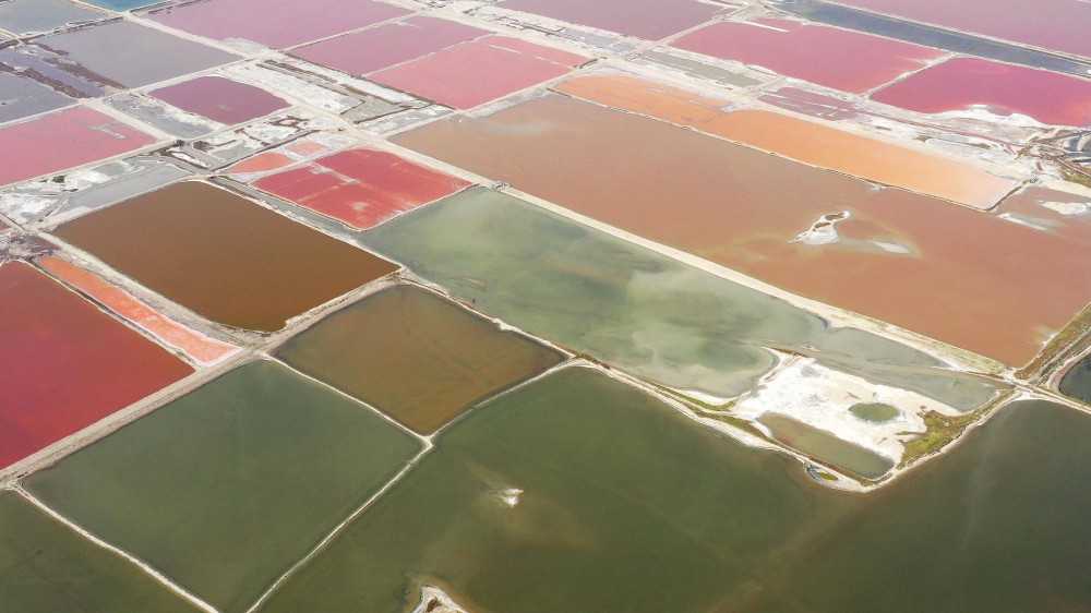 △运城盐湖。夏季是盐湖里微生物繁衍的旺盛期,不同的微生物使得盐湖的不同池水呈现出不同的色彩,造就了七彩盐湖的奇观。