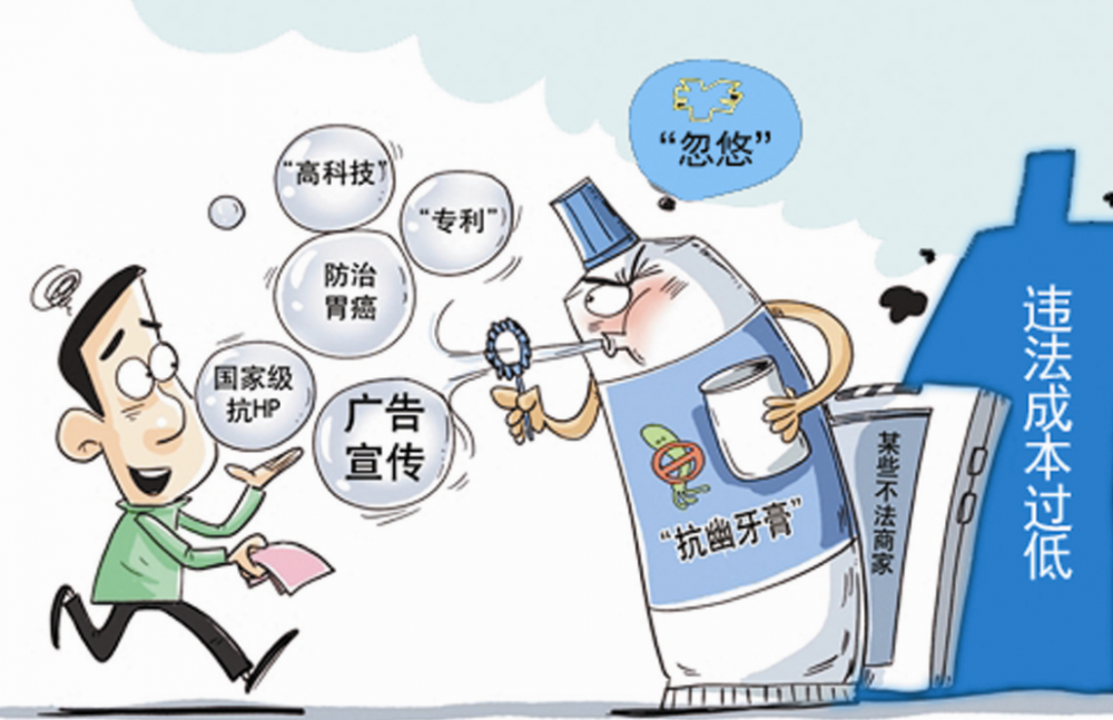 “用此牙膏,改善口疮、防治胃癌”“采用国家级抗HP(幽门螺旋杆菌)专利技术”……借助大量广告宣传,用凝胶或抑菌膏充当牙膏的所谓“抗幽牙膏”在电商平台和市面上热销。个别不良商家利用部分消费者急于见效、轻信宣传的心理,打着治病、保健等幌子,叠加“高科技”“专利”等概念推销产品,坑害消费者,扰乱了市场秩序,破坏了行业公信力。对此,消费者应擦亮眼睛理性判断,如确诊感染幽门螺旋杆菌,需及时前往正规医院进行专业诊疗,并在日常生活中注意养成健康的生活习惯,切勿轻信虚假宣传。有关部门应进一步加强线上线下市场监管,明确相关经营主体责任,让各种改头换面的违法违规产品无处藏身。